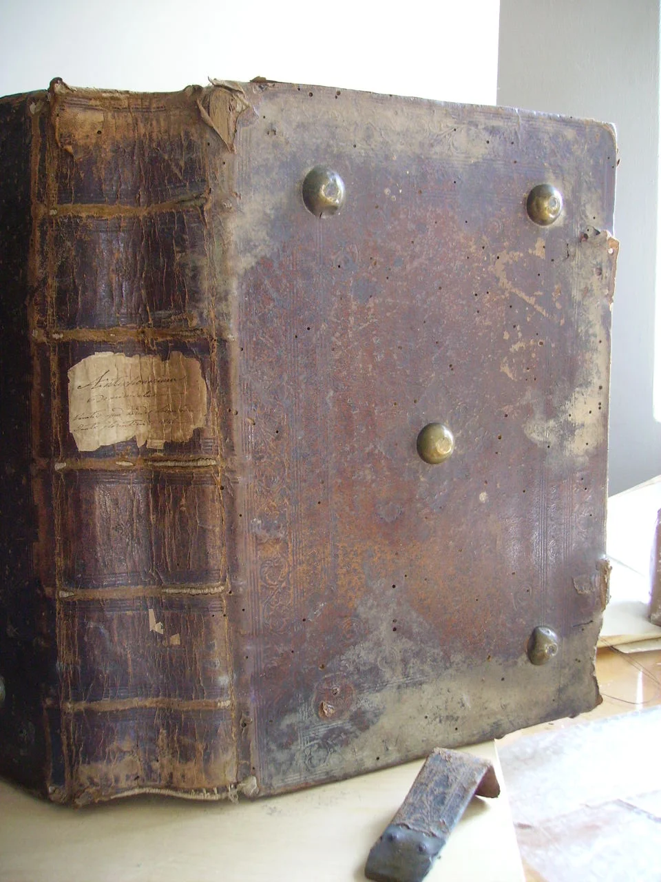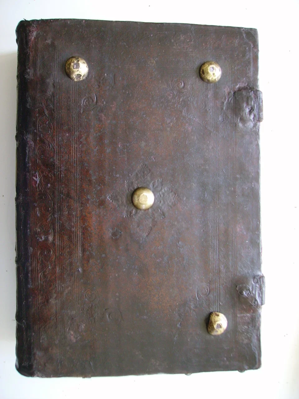 L'eccessivo peso del volume ha provocato tagli alla cuffia superiore e mancanze alla cuffia inferiore, i lacci in cuoio originali si sono strappati in prossimità del piatto posteriore, la pelle è complessivamente rovinata con innumerevoli fori di tarlo che attraversano i piatti in legno fino ad arrivare alla carta del volume interno.